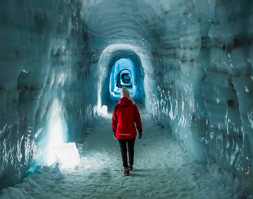 Prevé entre 45 y 60 minutos para explorar cómodamente los túneles de hielo, las esculturas y el lago glaciar subterráneo.