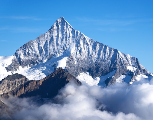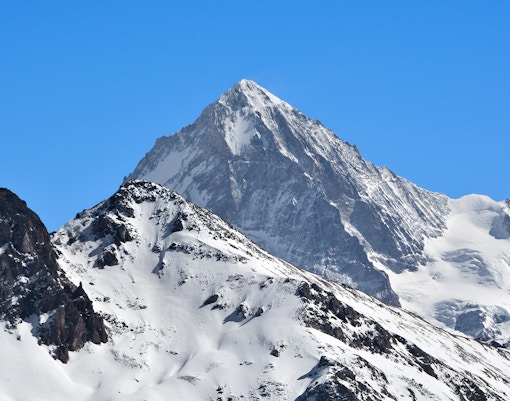 Wznoszący się na wysokość 4 506 m Weisshorn jest jednym z najpiękniejszych szczytów w Alpach, a jego grzbiety widoczne są poza doliną Zermatt.