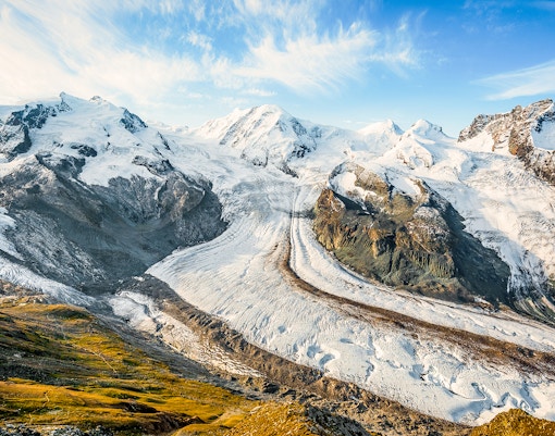 Mierzący 4634 m n.p.m. szczyt Dufourspitze jest najwyższą górą w Szwajcarii i drugą co do wysokości w Alpach, a jego masyw pokrywają rozległe lodowce.